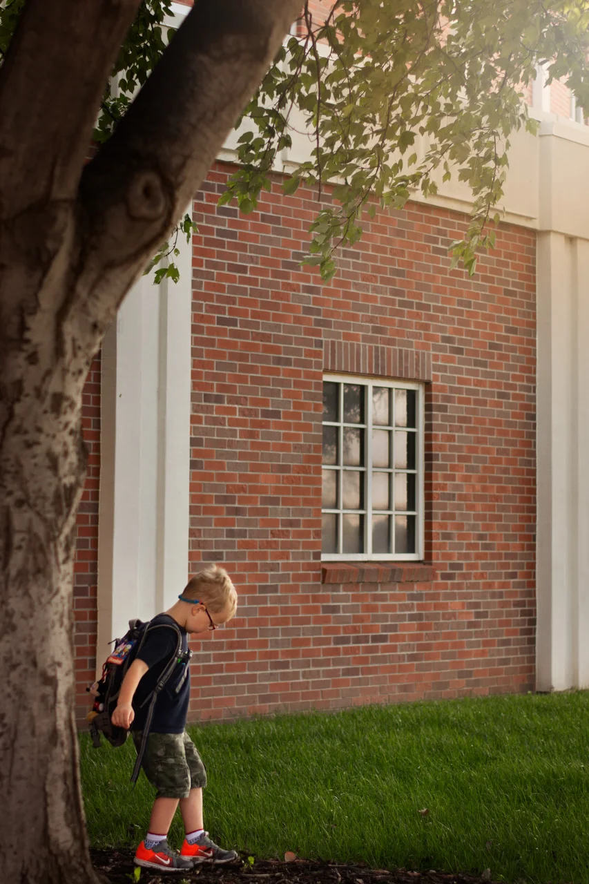 On the occasion below, we were very early to my son’s first day of preschool, and pretty much had the front entrance to ourselves. I let him explore a bit and took this image of him after waiting for him to walk under that beautiful tree and light. I also wanted to capture some of the pretty architectural detail of the church building.