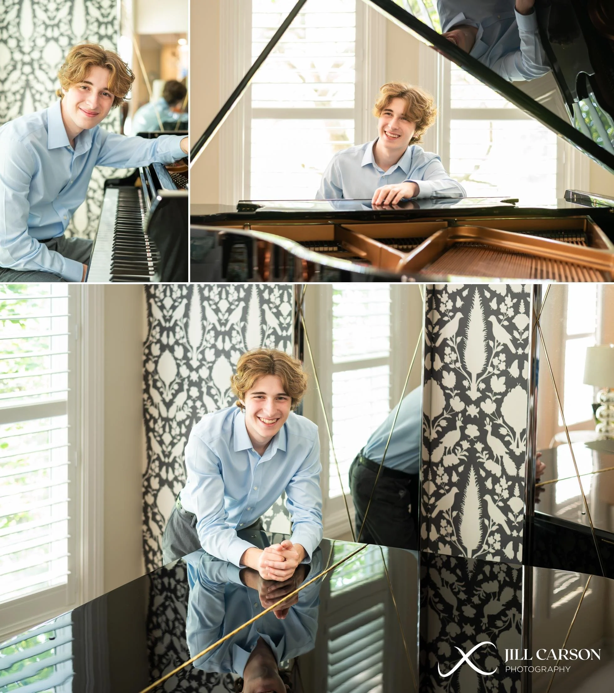 First up: grand piano!! We started inside at his family home, and after getting the shots we needed with the piano, we headed outside for some more formal portraits using their landscaping as our backdrop. Once that was over, I asked Miles, “Would you be up for a little drive over to the high school? I have some ideas for your marching band portraits.” I had noticed the band trailer parked at the school when I was out scouting a few days prior, so we started there. I just love the images of him with the Wildcat mascot in the background. As we reached the end of session 1, we headed to the entrance of the school, and used some exterior features of the school to get creative with perspective, point of view and reflections using windows!